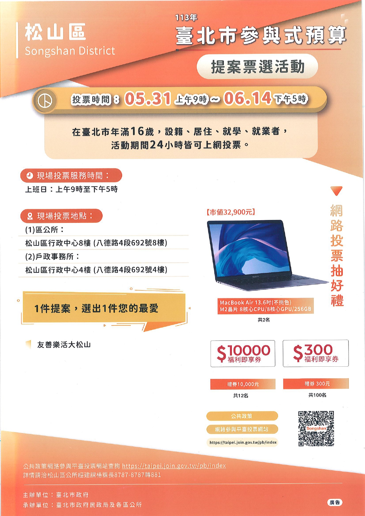 大家好,本年參與式提案由松山社大提出「友善樂活大松山」參與式預算案子,經住民大會、審議委員通過,現在進行IVOTING,通過後松山區將進行環境清潔維護、擁有獨特造型煙蒂桶、攤販油煙污水不再亂排放,歡迎大家踴躍報名參加投票。詳情連結